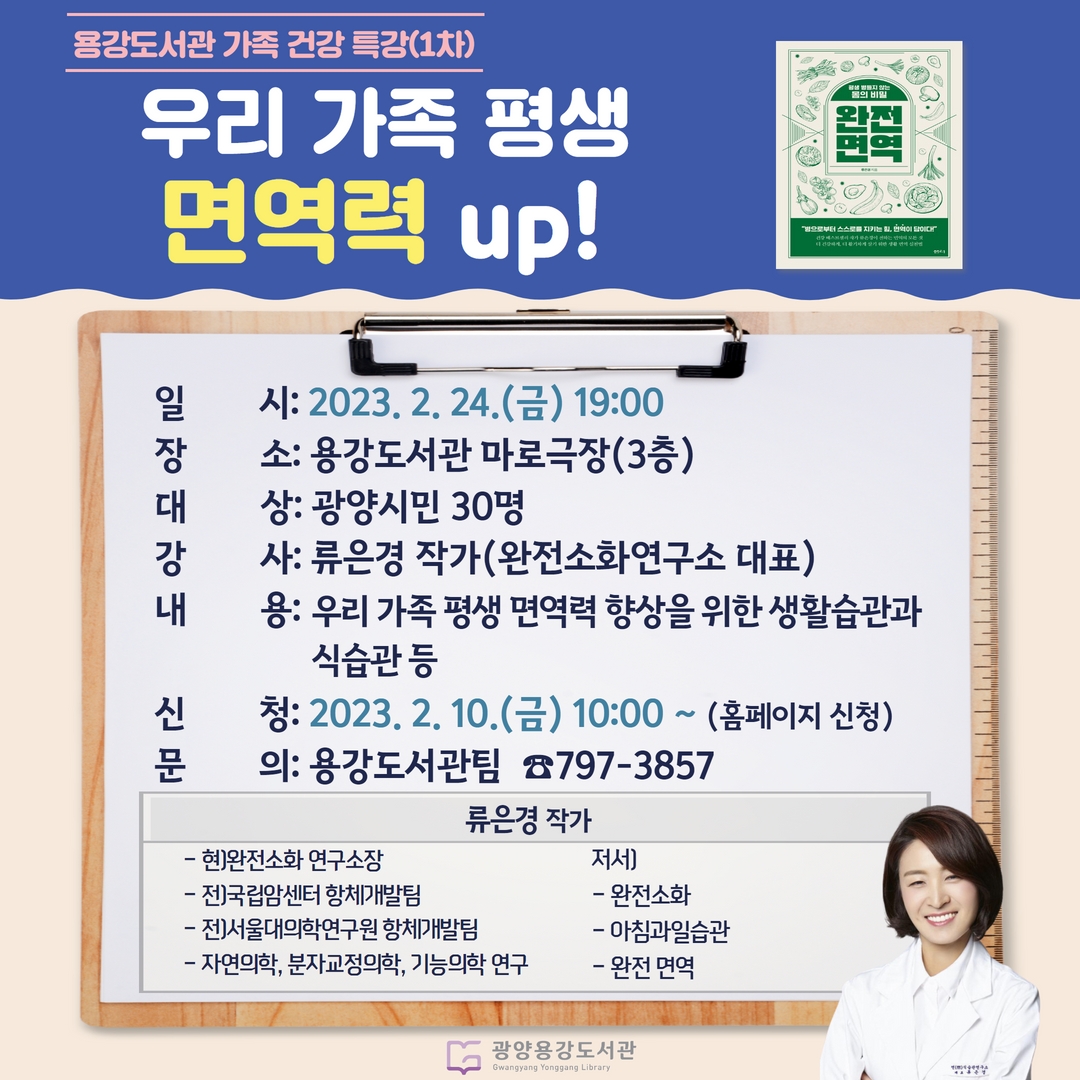 이번 강연은 코로나19 이후 우리 건강의 가장 큰 관심사가 된 면역력에 대한 강연으로 ‘완전 면역’의 저자이자 면역력 전문가로 알려진 류은경 작가를 초청해 유익한 건강 지식을 전달할 예정이다.