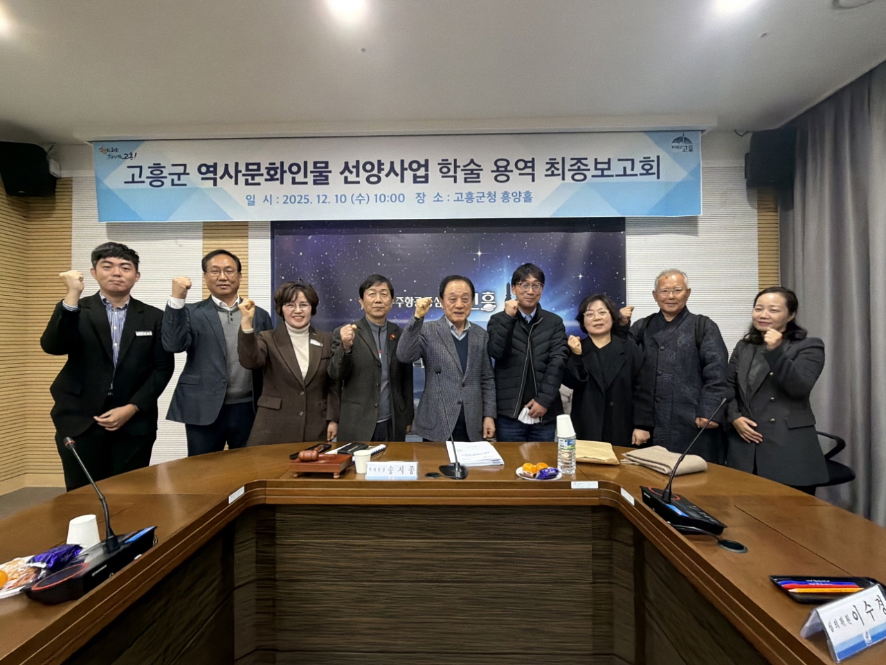 고흥군(군수 공영민)은 지난 10일 군청 흥양홀에서 ‘고흥군 역사문화인물 선양사업 학술용역’ 최종 보고회를 열고, 지역 인물자원 조사 결과와 향후 선양사업 추진 방향을 공유했다고 밝혔다.