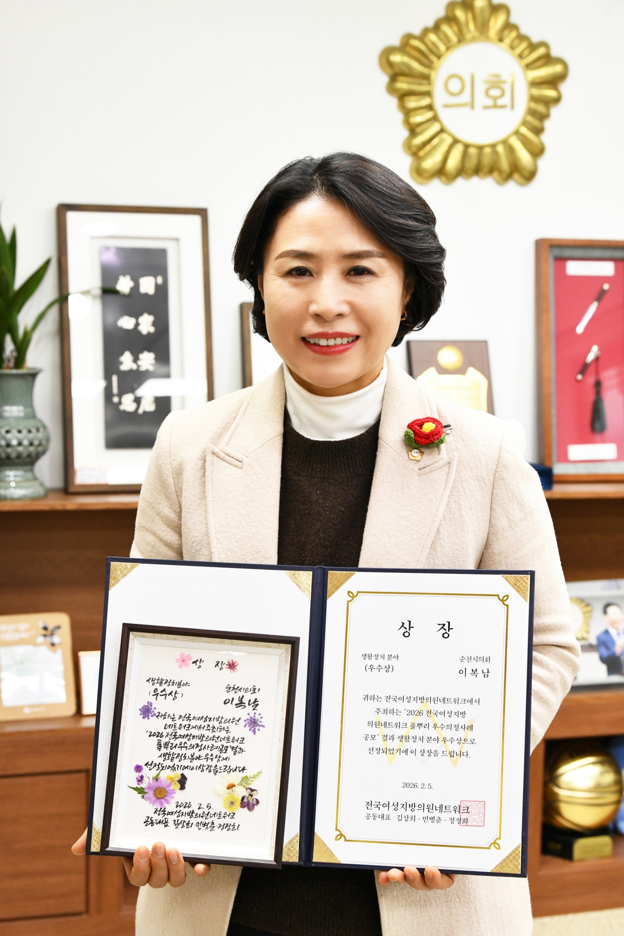 순천시의회 이복남 의원(조국혁신당, 향‧저전‧중앙‧매곡‧삼산동)이 5일 국회 의원회관에서 열린 ‘2026 전국여성지방의원네트워크(이하 전여네) 풀뿌리 우수의정 사례 공모’에서 생활정치 분야 우수상 수상자로 선정되었다.