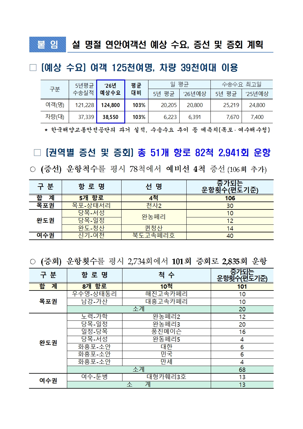 박근식 전남도 해운항만과장은 “설을 맞아 고향을 찾는 귀성객과 섬 주민이 보다 안전하고 편안하게 여객선을 이용하도록 유관기관과 긴밀히 협력해 안전관리와 수송 대응에 최선을 다하겠다”고 말했다.