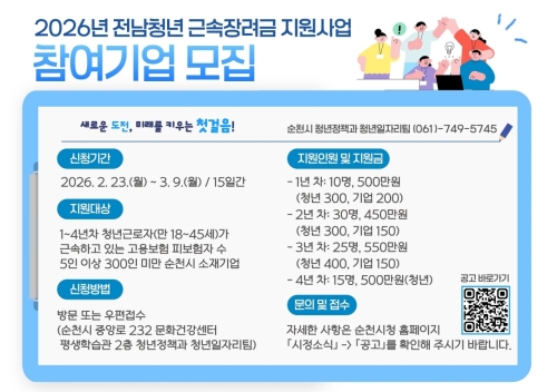 순천시 순천시는 지역 청년들의 정규직 취업 촉진 및 장기근속을 유도하기 위해 2026년 전남 청년 근속장려금...