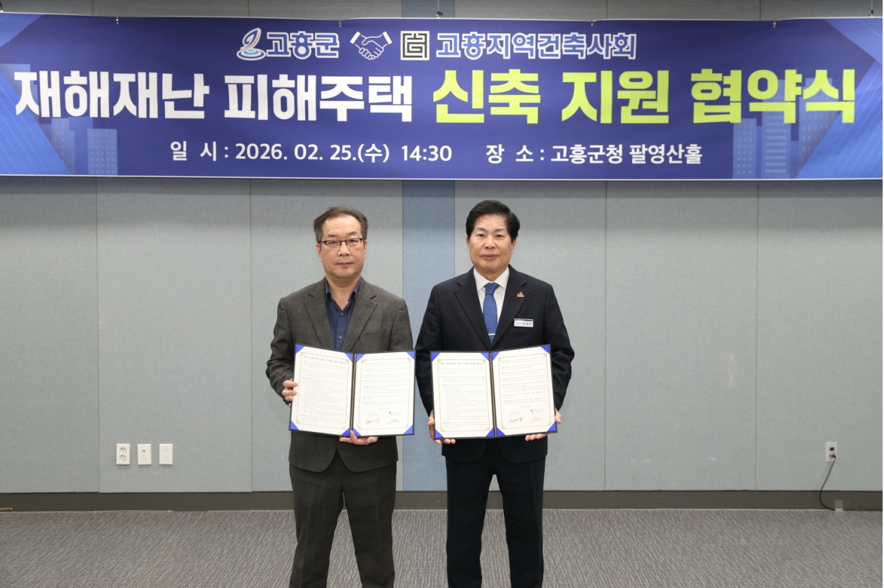 고흥군(군수 공영민)은 지난 25일 군청 팔영산홀에서 고흥지역건축사회(이하 건축사회)와 재난 피해주택 지원을 위한 업무협약을 체결했다고 밝혔다.