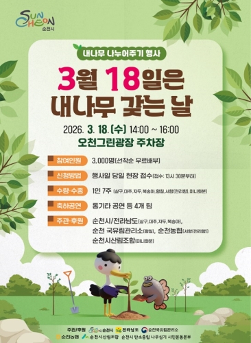 순천시 순천시는 오는 3월 18일 오후 2시 오천그린광장 주차장에서 「내나무 나누어주기 행사」를 개최한다고 ...