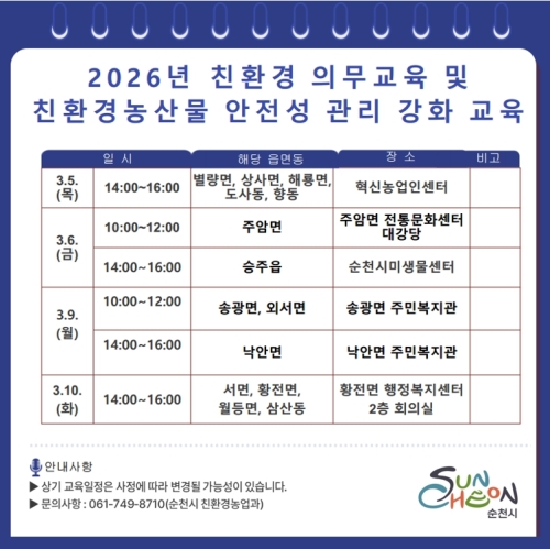 순천시 순천시는 오는 5일부터 10일까지 총 6회에 걸쳐 혁신농업인센터와 행정복지센터 등에서 친환경 농산물을...