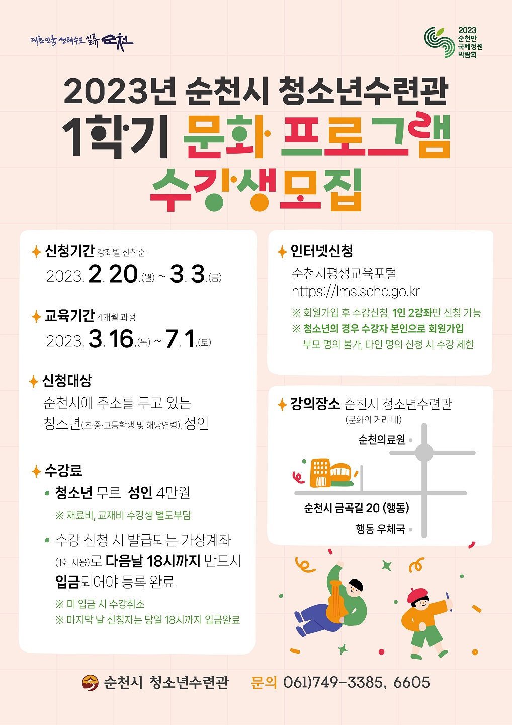 순천시(시장 노관규)는 오는 20일부터 3월 3일까지 ‘2023년 1학기 문화 프로그램’수강생을 모집한다.