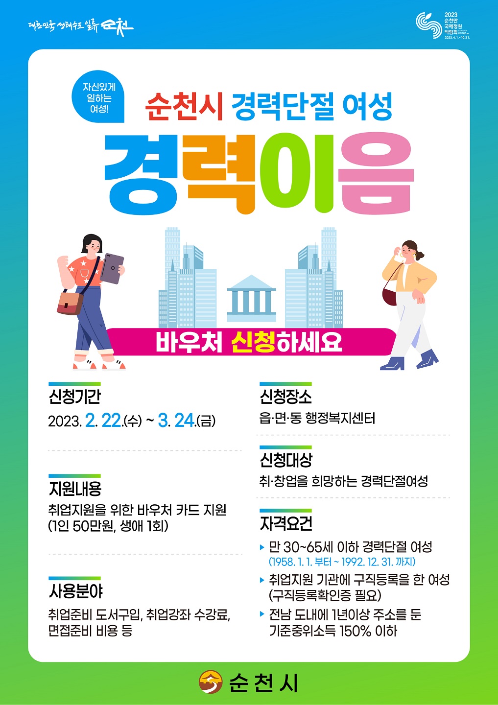 순천시(시장 노관규)는 취업을 준비하는 경력단절 여성에게 바우처카드 포인트를 20만원에서 50만원으로 확대 지급한다.