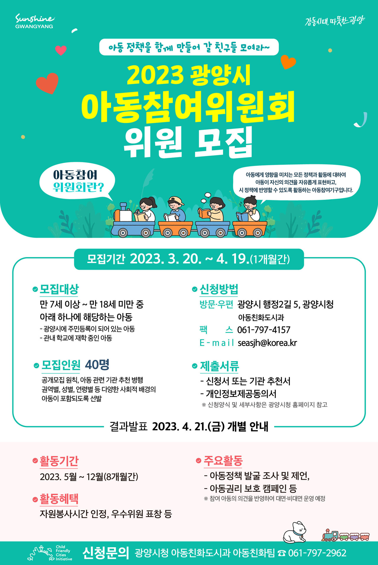 광양시는 아동의 인권향상과 권익 증진을 도모하기 위해 아동의 눈높이에 맞는 다양한 의견을 수렴하기 위한 ‘광양시 아동참여위원회’ 위원 40명을 오는 4월 19일까지 모집한다고 밝혔다.