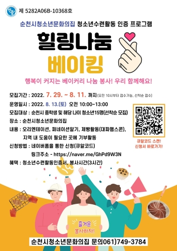 순천시-힐링나눔 베이킹 홍보물 순천시(시장 노관규)는 오는 8월 11일까지 청소년문화의집 ‘힐링나눔 베이킹’...