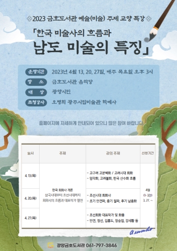광양시-금호도서관, 4월 예술(미술) 특강 홍보물 광양금호도서관이 ‘한국 미술사의 흐름과 남도 미술의 특징’...