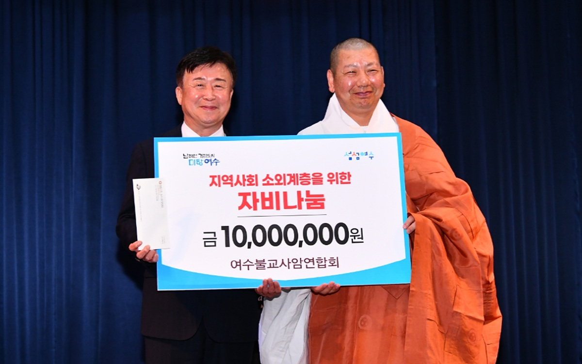 이날 여수불교사암연합회는 회장 취임법회를 기념해 지역사회 소외계층을 위한 자비나눔 1000만 원을 여수시에 전달했다.