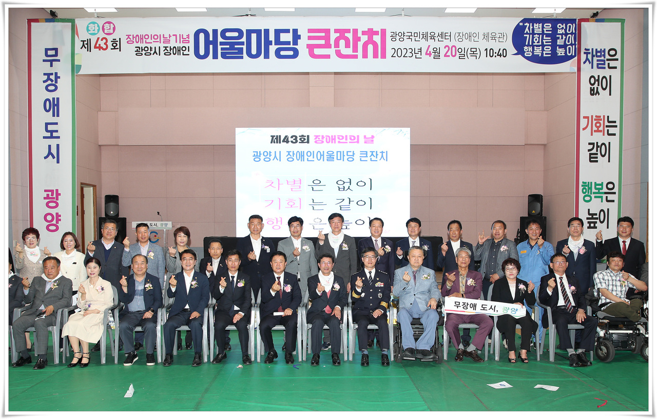 광양시는 20일 국민체육센터에서 ‘차별은 없이, 기회는 같이, 행복은 높이’를 슬로건으로 ‘제43회 장애인의 날’ 기념행사를 개최했다고 밝혔다