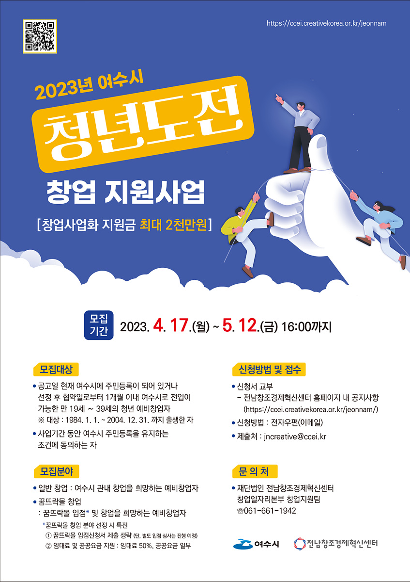 여수시(시장 정기명)가 ‘청년도전 창업 지원사업’ 참여자를 내달 12일까지 모집한다.
