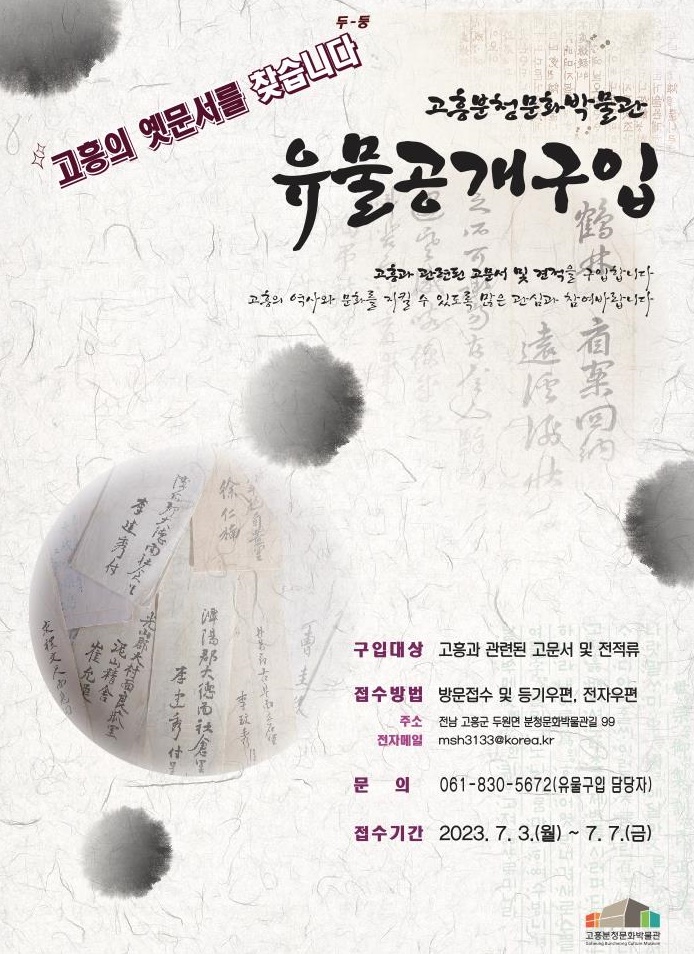 고흥분청문화박물관은 고흥의 역사와 문화를 지키고, 지역의 역사를 담은 향토자료를 지속적으로 확보·보존하고자 고흥과 관련된 고문서 및 전적류를 공개 구입한다고 밝혔다.