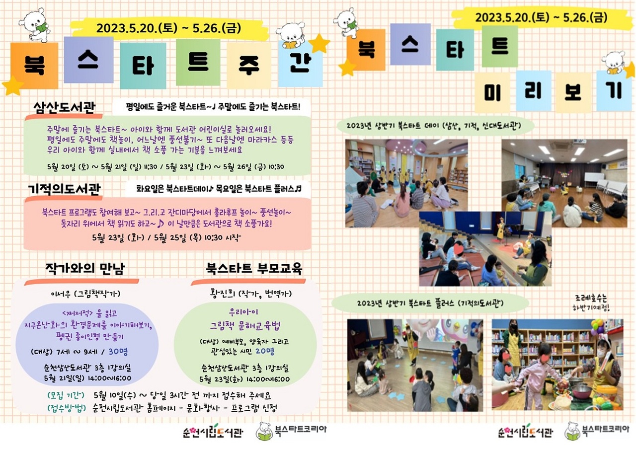 순천시립도서관에서는 삼산, 기적, 신대도서관에서 북스타트 주간(20~26일)을 운영하며 강아지를 주제로 구성된 그림책 큐레이션, 어린이실 포토존, 피크닉존 운영, 양육자와 아이가 도서관을 방문하여 책을 대출하면 강아지 스티커를 증정한다.