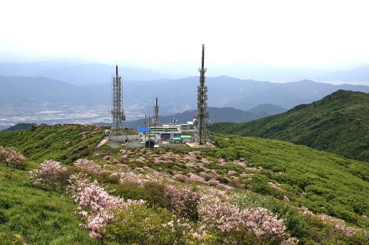 지리산 노고단(해발 1507m) 정상에 분홍빛 철쭉이 활짝 피어 있다.