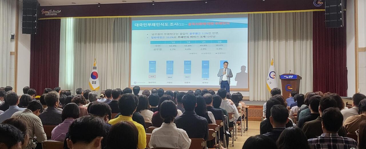 청렴 교육은 국민권익위원회 부패방지국 이영택 행동강령과장을 강사로 초빙해 공직자 이해충돌방지법과 청탁금지법, 공무원 행동강령 등을 내용으로 2시간 동안 진행됐다.