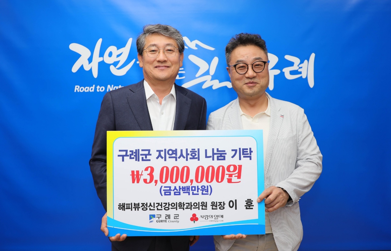 전남 구례군은 지난달 18일 구례해피뷰건강의학과의원(원장 이훈)에서 관내 어려운 이웃을 위해 기부금 3백만 원을 기탁했다고 밝혔다.