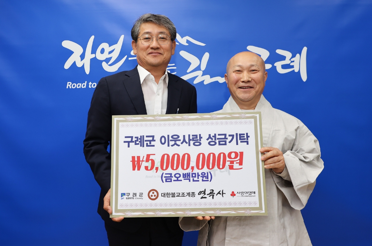 전남 구례군은 지난 5일 대한불교조계종 지리산 연곡사가 관내 어려운 이웃을 위해 성금 5백만 원을 기탁했다고 밝혔다.