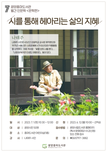 광양시-시를 통해 헤아리는 삶의 지혜 홍보물 광양중마도서관은 오는 7월 1일 오전 10시 30분, 중마도서관...