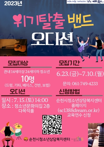 순천시-위기청소년 맞춤형 지원 위기 탈출 밴드부 오디션 홍보물 순천시 청소년상담복지센터는 정부 국정과제 모두...